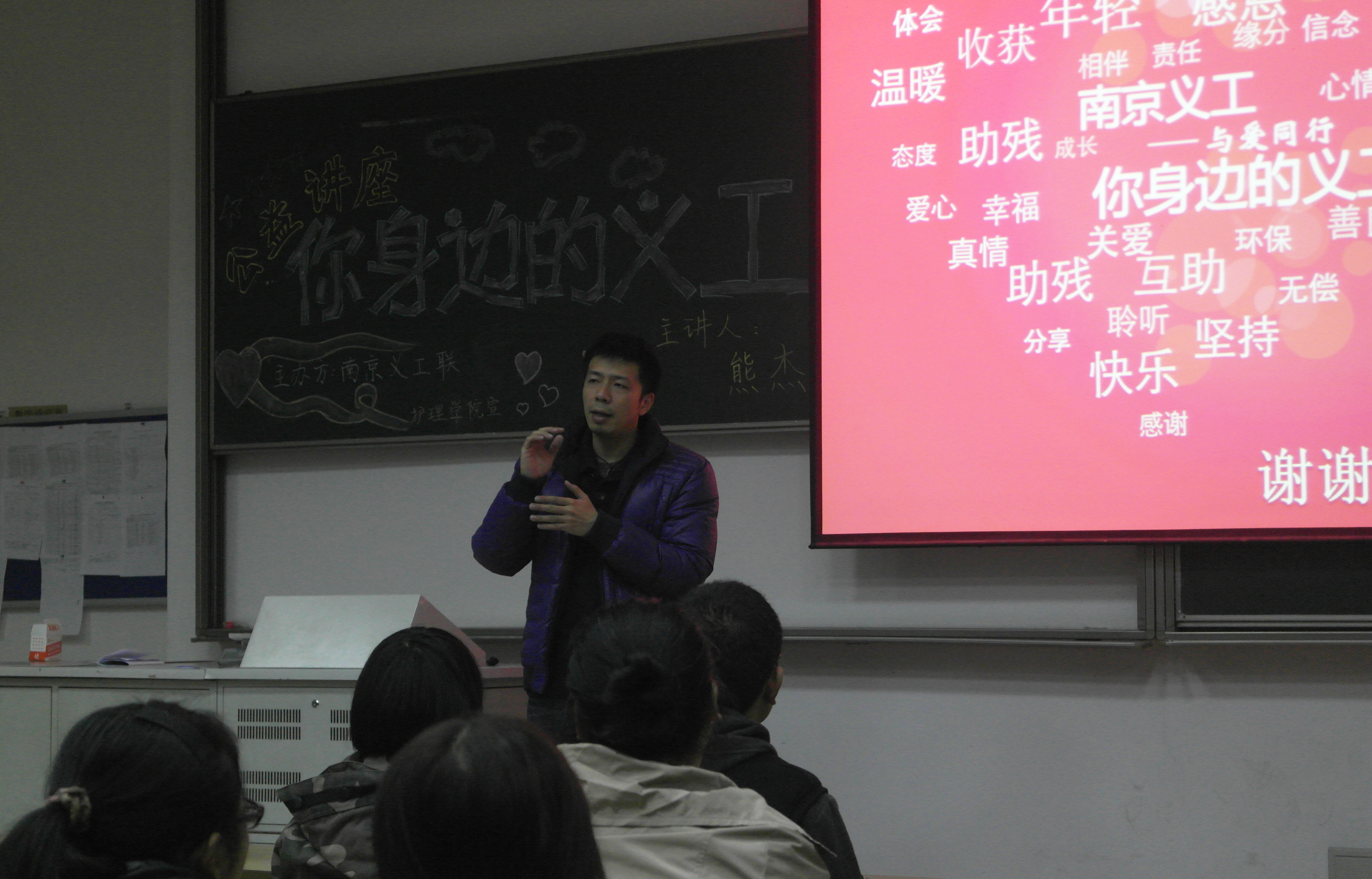 在讲座上,熊杰老师首先向我们介绍了义工的概念及由来,然后他联系自身的工作,向我们讲述了南京义工联的相关情况。通过义工们参加公益助学、公益手语班、公益盲文班、公益夏令营等活动的图片,我们对志愿者这个概念有了更深层次的理解。其中,他着重向我们强调了做义工的意义:“我们去做义工的出发点不尽相同,或许基于同情心,或许基于自身需要得到他人的认可。但最后我们都会领悟到同样的东西,那就是尊重和分享……”他提到,这种爱心的延续和传递,并非局限于简单的同情心,更重要的是要有同理心。用简单的陪伴,让弱势群体体会到关爱。尤其重要的是,用一颗柔软的心去用心体会他人的感受。