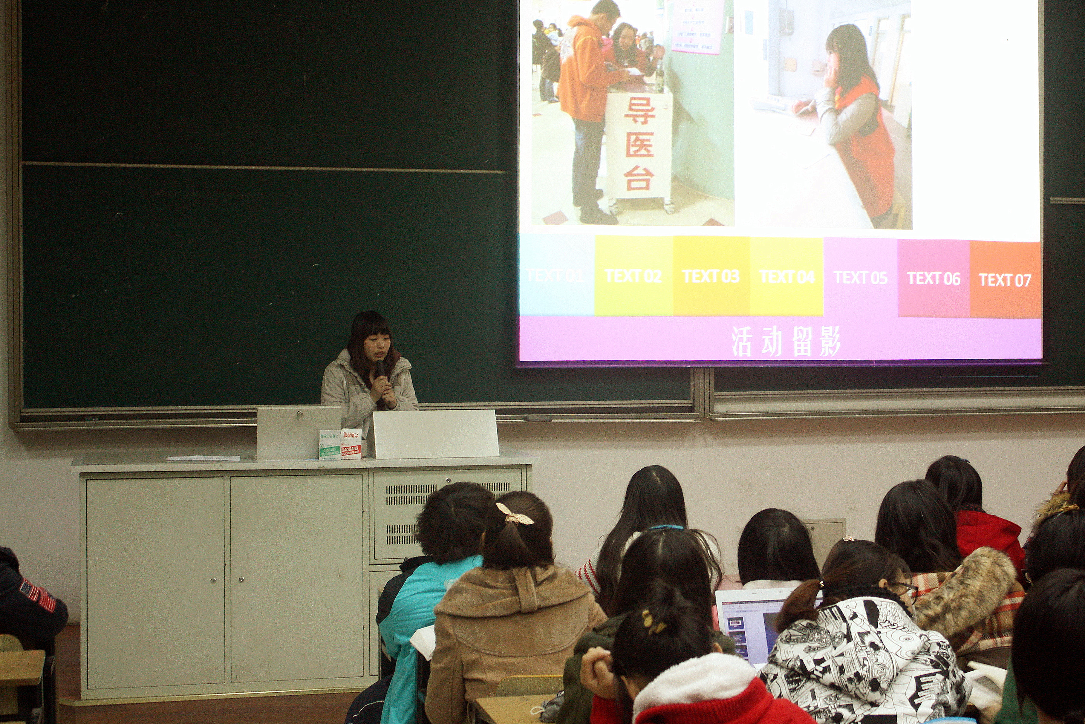 当大家还回味着大一大二学姐精彩的志愿故事时,大三的学姐们接下来的分享顿时让我们对今后的人生有了新的规划和新的期盼。她,俞俊俊,来自11级护理2班。她说,志愿服务是大学生活的一个缩影,是自己引以为豪的标签,不疲倦,不孤单。由最初在地铁站,敬老院,医院的热心服务到志愿活动的统筹安排和联系规划,她从胆小青涩走向了成熟稳重。志愿剪影上她那用心工作的表情,和善可亲的微笑感染了现场每一个人的心灵。她说,在一次敬老院志愿过程中,曾见有一个70多岁的老人因为没有见到家人而在其面前嚎啕大哭。当时她的心中顿时就明白了责任心的重要,并决定将爱心传递去感染每一个人。紧接着是来自11级3班的徐颖,11级5班的韩倩和郑紫会等人展示的志愿风采。她们的经历都淋漓尽致的诠释了“坚强持久的毅力成就完美的人生”、“简简单单的微笑换来人生的蜕变”等道理。