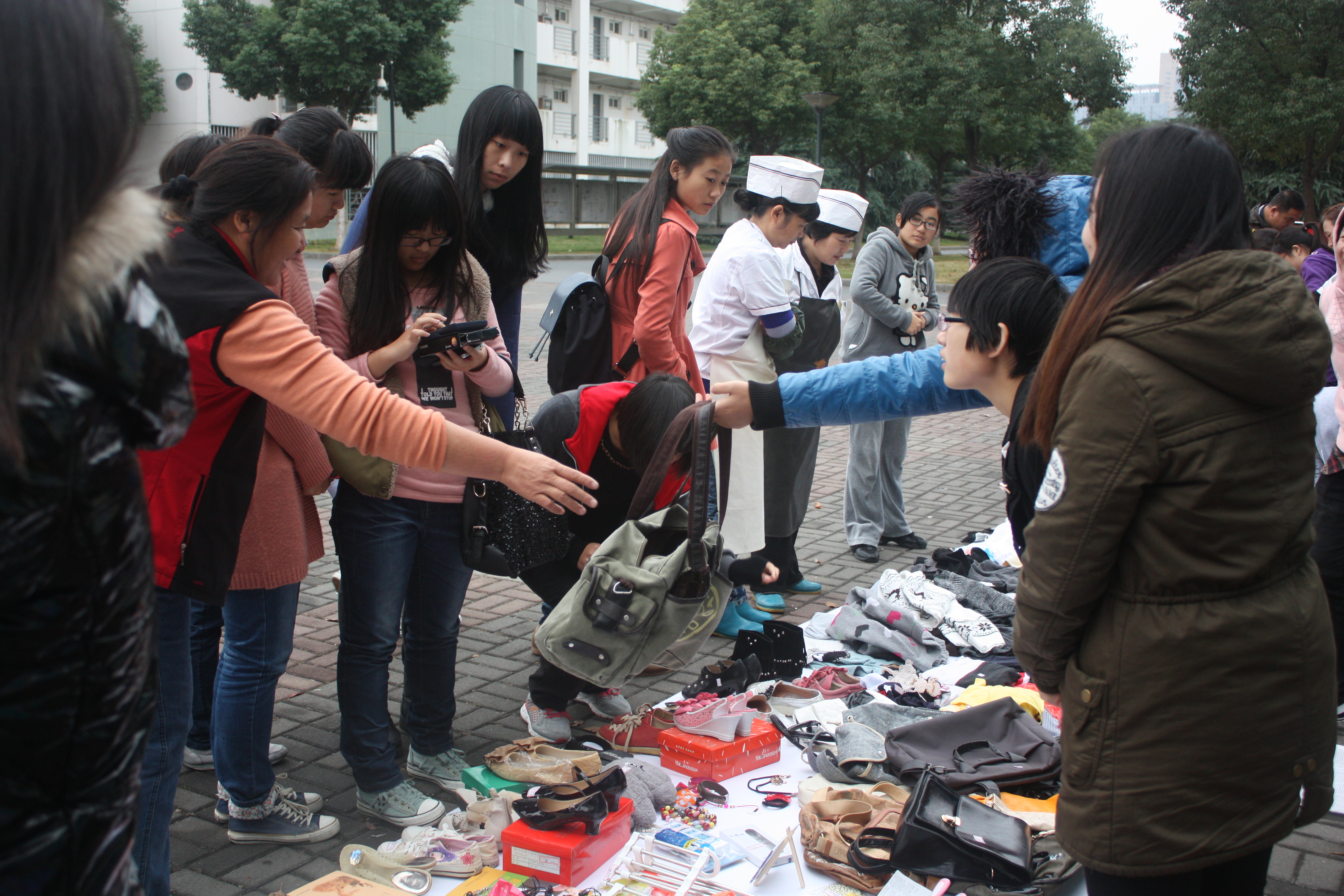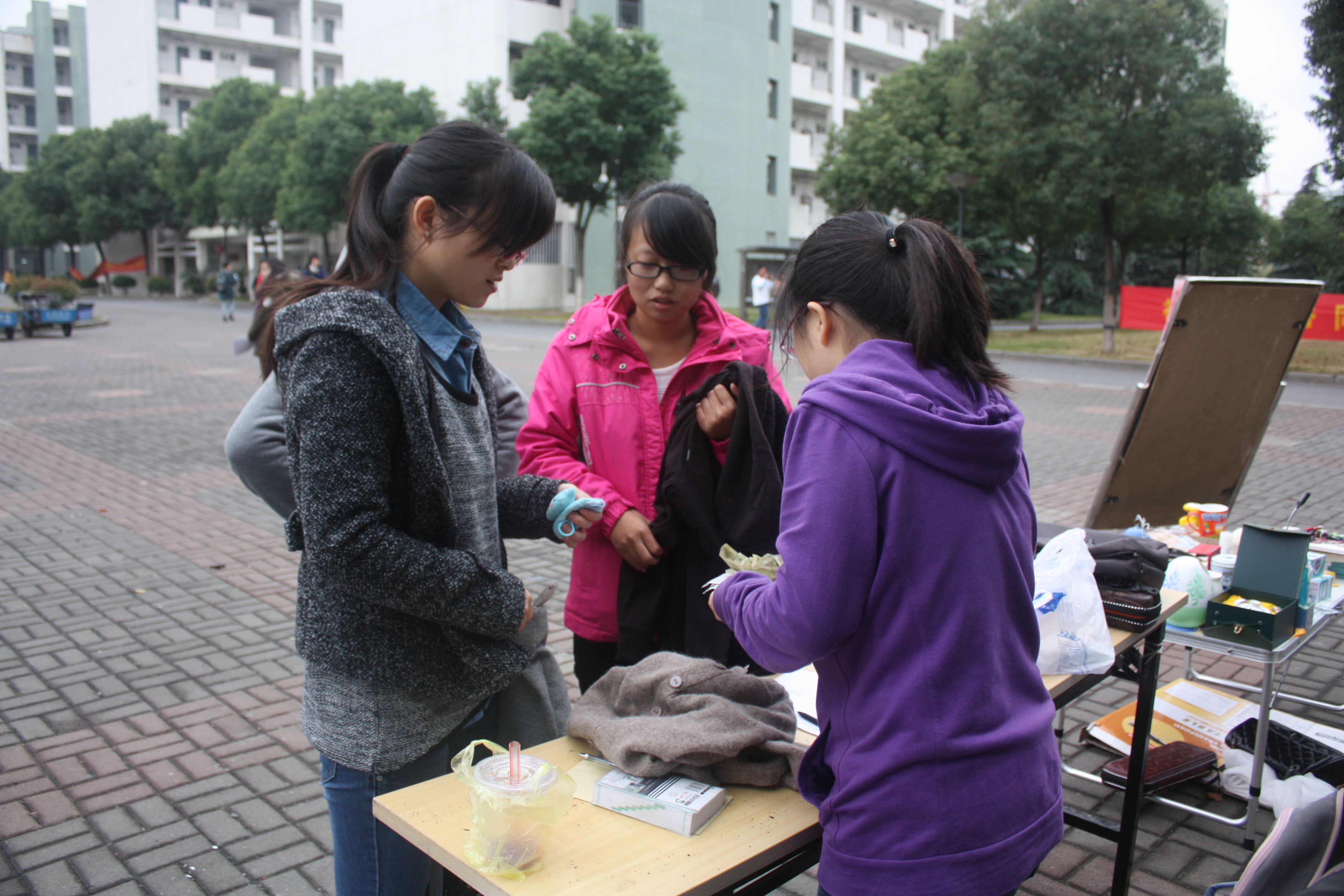 渐渐地,前来围观的人多了起来,大家也感觉到买这儿的东西既物美价廉又能奉献爱心,一举两得,志愿者们又热情地“促销”,活动到了高潮。之后还陆续有几个女生捐了几大包衣服和包包,值得一提的是,有个男生捐赠了衣服和书,还执意不肯留下联系方式。看到大家都这么热情,志愿者们的工作热情也更加高涨,忙得不亦乐乎。