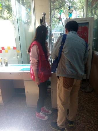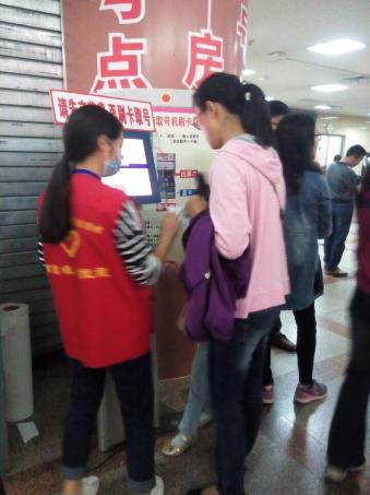 接下来便是到各自负责的岗位工作了。医院是人流量最大的一个地方,特别是服务台,被围得水泄不通。志愿者负责帮病人拿取化验单,拿票和自助挂号缴费等内容。由于科技的进步,数字化和机械化的医疗服务越来越多,但是这也有一个很大的弊端—很多人不懂得怎样去使用这些机器,所以志愿者的帮助就显得尤为重要。上午半天是最忙的时候,到了吃午饭的时间,不得不说,儿童医院的伙食还是非常不错的,志愿者们顾不得休息,匆匆吃完饭就又开始了自己的工作。