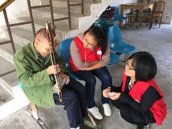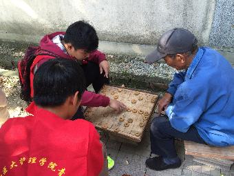 树荫下,坐着聊天的老人们,见到穿着红色志愿服的学生,他们脸上立即露出了开心的笑容,志愿者们也不怠慢,迎上前介绍了自己后便与老人们攀谈起来。两三位志愿者坐在一位失明的爷爷旁,听他讲述淳化的变迁。虽然爷爷看不见,但透过他的言语,大家可以感受到他内心的激动与自豪,志愿者们深受感染,也时不时地赞叹不已。另外几位男生志愿者则陪着几位老爷爷打起了扑克,虽然没有爷爷们打得精明,但能够让他们开心,也足够了。还有几位心细的女生志愿者陪着几位老奶奶聊起了家常,虽然聊的都是些生活琐事,但看到奶奶脸上慈祥的微笑,大家也心满意足了。