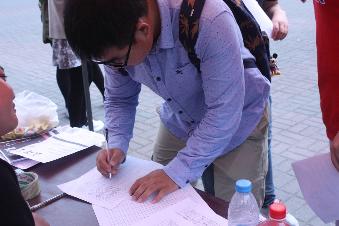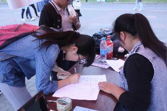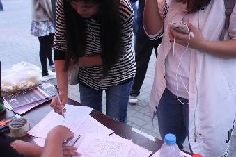 报名刚开始时,广场上的人并不多,所以报名的人自然比较少,然而负责宣传的同学们一点没有被影响,一直坚持向同学宣传。12:00左右,路过的人越来越多,报名点渐渐被热情的同学包围,随处可见的是一个个弯腰写下自己名字的身影。
