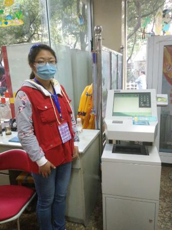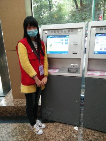 而在旁边相隔不远的自助挂号机附近也能看到同学们的身影,在那里,他们将为挂号缴费的病人提供帮助服务,只见他们指导病人家属拿出市民卡或医保卡插入卡槽,熟练地在机器上按下几个按钮,然后再根据机器提示指导家属拿出银行卡缴费,遇到无法解决的问题就耐心咨询身边的老师,争取为每一位就医人员做到快速高效的服务。