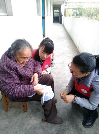 几个志愿者受到老爷爷的启发,仔细耐心的帮老人剪指甲,聊天,力所能及的让老人感到温暖。他们在寒风中帮老爷爷移栽花朵逗得老爷爷哈哈大笑,一个劲的夸我们是好孩子。坐在石凳上的老人们也被温暖的氛围感染,时不时和志愿者们搭几句话,引来一阵欢声笑语。