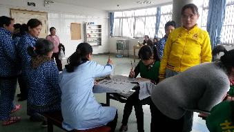 到了三病区之后,同学们在门外等着护士给我们开门的时候,好多人都很热情地和我们打招呼,说:“志愿者你们来啦!我好开心啊!”那一瞬间就被感动了,原来她们这么期待志愿者的到来!今天的活动开展的很顺利,打牌的打牌,写字的写字,画画的画画,唱歌的唱歌,一切都井然有序。有位姐姐特别喜欢画婚纱,每画一样都能说出寓意,真心觉得姐姐很棒!然而这一次活动中,也有位阿姨特别执着的和志愿者借手机,说要打给她的女儿,但志愿者都遵守不能借手机的原则,拒绝了阿姨的请求。总体上活动室的气氛很和谐。