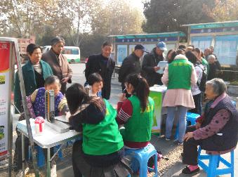 20151114日是“联合国糖尿病日”,南医大完美在线官网蒲爱园青协四位志愿者与南京绿丝带义工围绕糖尿病日“健康饮食与糖尿病”主题宣传活动共同参加了方山社区糖尿病日志愿健康宣传。