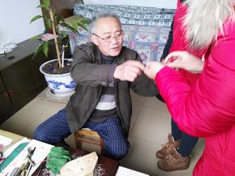 一阵寒暄后,我们进入爷爷的房间,一眼看到的便是电视和床旁边桌上的爷爷亲自手工制作的花,其次是置于房中间的盆栽(那是爷爷刚买不久的),之后爷爷坐下,打开了一本厚厚的杂志,我们惊奇的发现里面有雕刻的样本,各式各样,爷爷拿了一孔雀花样的样本(已完成一半了),雕刻给我们看,刀刀都十分有力道,一看就知道是经常雕刻的人。王爷爷让人感到惊奇的还不止这一处呢,随后在墙上,爷爷的手腕,甚至车钥匙扣上都发现了核桃雕成的小提篮,葫芦,珠子等,或成串,或成链,或散着,让人看了以后,特别自己也想有呢。爷爷说那都是他自己做的呢,以前在地里干活没时间,现在没有事情,做做这个有利于锻炼自己的脑力和体力。听了这句话觉得爷爷真是了不起呢。