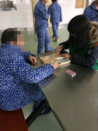 一来到病区,患者们就热情地围了上来,和我们志愿者打招呼,从我们带来的象棋、书本、扑克牌等物品中挑选自己喜欢的东西,其中不少都是老面孔了,一进病区就拉上我们一起打牌,还直说我记得你上次来过,下次也还要来和我打牌啊。每每听到这些,就会感到特别欣慰,感觉大家的志愿服务是有效果的,因为我们的陪伴,他们不再是一个孤独的群体,他们也和正常人一样,能够自由的和别人交流,表达自己的看法,能够拥有和普通人一样的快乐。不少原来我们来时他们只是站在一边看着的患者,现在也会主动来和我们聊天,找我们要扑克牌打牌,还会把他们写毛笔字的成果拿来给我们看,或者拿着书来和我们说这本书很好看让我们下次来的时候也要带过来……