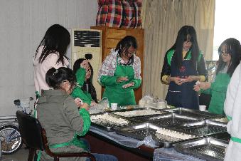 经过一个多小时的努力,大家已经把饺子包好啦!志愿者一人端一盘亲自把饺子送去食堂蒸熟,并且志愿者们很耐心的站在食堂外等待饺子出锅的那一刻。饺子蒸熟拿出来的那一刻,大家都很激动的掏出手机拍下照片留念。这是大家辛勤劳动的果实,所以大家都格外的重视,格外的期待。