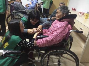 后来,我们有了新的任务,替老人们剪指甲。小伙伴又来到另一个奶奶身边,她生病了,中风了,不会说话。当同学伸出手要去帮她剪指甲时,死死的抓住了她的手,因为中风手在抖,但却牢牢的将志愿者的手攥在她那布满皱纹满是沧桑的手中。我们望向她的眼睛,不知是因为生病流出的泪,还是感动,但我们觉得,那是幸福的泪。