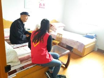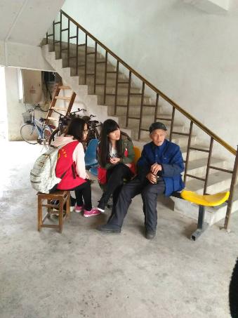 志愿者们到了敬老院后发现老人们大多都待在屋子里。于是,大家商量后决定两人一组到老人屋子里找老人聊天。一个小组很快的找到了一个人待在屋子里的老人,她们拉着老人亲切地聊天。大家看到出来散步的老人们都亲切的打着招呼:“爷爷(奶奶)出来散步呀!”爷爷奶奶们也会笑着向同学们回答:“对呀!雨停了,出来活动活动。”还有的老人坐在楼道那边聊天、听戏,其余的志愿者们就主动过去与爷爷奶奶聊天。