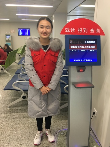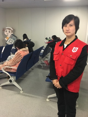 杨莹同学负责的是门诊三楼的妇产科,妇科的患者相对较多,等待中出现的问题也会相对增加。在患者不断地扫条形码确认顺序的过程中,不断地有人询问为什么这么慢,患者人群有了一丝骚动。但通过志愿者和护士的解释,最终没有造成大的影响。杨莹同学还向患者介绍了医院的app,方便病人就医。