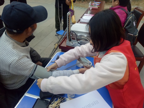 在老义工的带领下,志愿者们迅速地布置好了场地。这次活动旨在宣传保护未成年人,反对家庭暴力。南京绿丝带邀请南京医科大学的同学们前去做些健康测量,辅助老义工完成宣传任务。早晨的小区广场还有些阴冷,但是,陆续赶来的居民让广场热闹起来,志愿者的嘘寒问暖和健康宣传,就像冬日暖阳一样,捂热了大家心头。“奶奶,会有点痛哦。”志愿者正小心地给奶奶采血测量血糖,“血糖7.8,奶奶,要注意身体了啊,以前是不是有高血糖啊?”奶奶不好意思地笑了:“我高血糖好多年了,今天还没吃降血糖药呢。”志愿者回以微笑,提醒奶奶不要忘记每天吃药,又叮嘱很多注意事项。“爷爷,来这里。您弯一下胳膊,我来给您测一下血压。”另一位志愿者也在忙碌,她贴心替老人挽起衣袖,“高压135,低压75,爷爷您的血压很正常,快穿上外套吧,外面冷。爷爷要保持好身体呐。”一旁的老义工也在和社区居民交流,在看似普通的聊天过程中,适时地传播家庭暴力、保持健康、维护家庭和睦的知识。