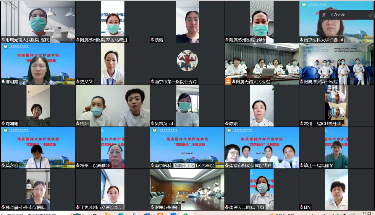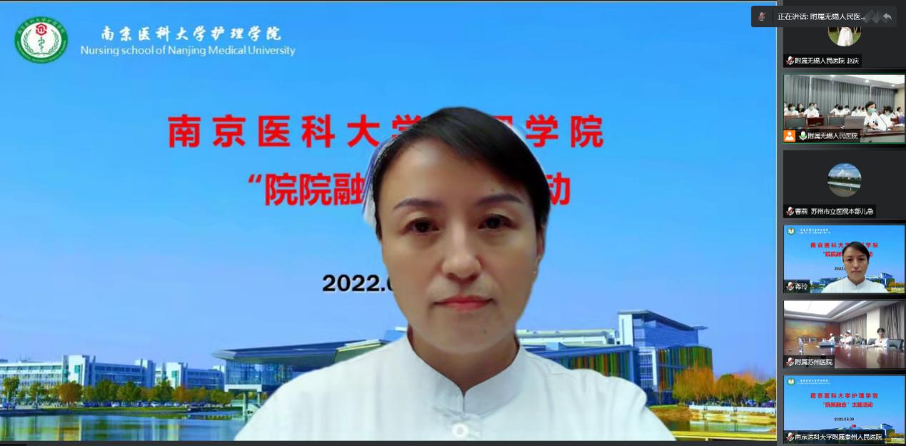为加强学院与附院全方位合作和交流,充分发挥自身优势,进一步推动护理学科建设和发展,9月30日下午,完美在线官网与附属无锡人民医院、附属苏州医院联合承办了“院院融合”线上主题活动。完美在线官网许勤院长、各附属医院临床护理教研室的课程负责人、教学秘书、教学骨干等人员参加了本次会议,在线人数达300余人。附属无锡人民医院护理部蔡英华主任主持了会议。